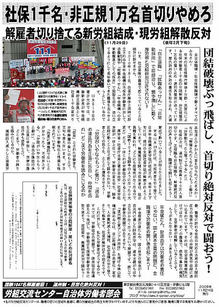 社保庁解体・民営化、職員全員解雇・選別再雇用と一千名分限解雇は、国鉄分割民営化以上に悪らつな全労働者への攻撃です。残った労働者に対しても極限的な労働強化が待っています。「去るも地獄、残るも地獄」となることなど断じて否! 不採用通知に怒る一千名の誇りある労働者ノーを先頭に、解雇絶対反対で闘おう。「一切の無駄の排除」と「東アジア共同体」を掲げ、道州制・民営化と戦争に突き進む鳩山民主党・連合政権を打ち倒そう。労働者として団結を固め、断固うって出ましょう。