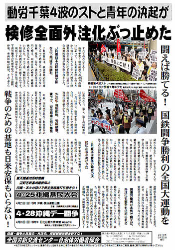すべてのみなさん!動労千葉・動労総連合の渾身の闘こんしんいによって、JR東日本がこの4月から強行しようとしていた検査・修繕業務の全面外注化を断念に追い込む画期的勝利が勝ち取られました。