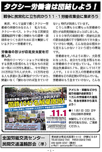東京、そして全国で働くタクシー労働者の仲間のみなさん! 私たちは、タクシーやバス、トラックなど民間交通運輸部門で働く仲間たちの連帯・団結体をつくり出すために日々奮闘しているタクシー労働者です。