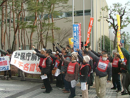 2・2の市長抗議行動、2・22健康推進部長抗議行動や議会闘争のたびに八尾市は自治体労働者をピケや弾圧のために動員し、八尾北労組と対立させようとしてきました。しかし、そのたびに八尾北労組組合員が八尾市と非和解であることを確信させ、団結を固める場になってきました。さらに自治体労働者と団結する場に転化して闘っています。自治体労働者の現場には人事評価制度への怒りと不安が充満しあふれ出そうとしています。八尾北労組は闘いの中で共産党を民営化の手先として暴き出しました。人事評価制度に「協議を尽くせ」と反対ではなく、当局と一体となって推進する自治労連・共産党執行部の裏切りを打ち破る労働者の決起を共に作り出していきます。道州制粉砕の第2ラウンドの闘いに突入します。全国の仲間のみなさん。共に闘いましょう。(3月21日 書記長 灰垣美佐子)