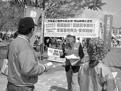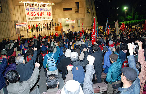 4・25沖縄県民大会と連帯し、「普天間基地即時閉鎖、辺野古新基地建設阻止、4・28沖縄デー集会」が東京・日比谷野外音楽堂で開催され800人が結集。交流センターの青年労働者が集会を牽引した。