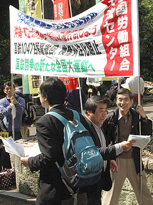 今年1月、〈社保庁の改革〉の名のもとに、社会保険庁分割・民営化が強行され、日本年金機構が設立された。「国鉄改革の完遂」(前原国土交通省)である360万人公務員全員解雇を狙った道州制導入の始まりだ。当時1万2566名の職員のうち、525名の公務員労働者が分限免職処分、数千人に及ぶ非正規雇用労働者が雇い止め、そして、633名が“退職”という形で、首を切られた。これに対し、被処分者から78名が、人事院への不服申立に決起している。国鉄1047名に続く闘争の始まりである。