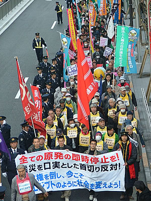 11春闘のさなか、3月11日東日本大震災が発生した。地震と津波による万余の死者、行方不明者が出て、加えて福島原発の放射能汚染が襲いかかる。全国労組交流センターと動労千葉は、救援対策本部を設置、労働者の団結した力で被災地を全力で救援しようと被災された労働者と一緒に生き抜くための闘いを開始した。共にガンバロー!!