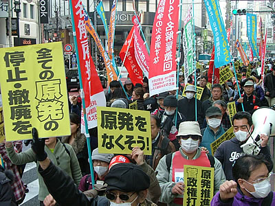 千人もの参加者による反原発デモが行われました。インターネットやツイッターなどで集まった参加者は若い人が多く、その大半が初めてデモに参加する普通の人々でした。核の持つ危険性、その恐ろしさを覆い隠す東京電力資本と菅政権のペテンにもう騙されるものかと、具体的な行動に突き進んでいます。
