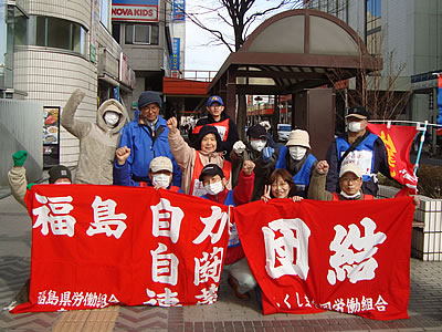 3月20日は福島駅前、21日は郡山駅、27日からは毎週日曜、福島駅前街宣に連続決起しています。「震災を理由にした解雇を許すな」「すべての原子力発電所をただちに停止し廃炉にせよ」の2つの要求を掲げた署名用紙(4月からはヒロシマ・フクシマの呼びかける統一書式署名用紙に切り替え)、ふくしま合同労組3・26声明、福島・みやぎ労組交流センター共同声明文、救援対策本部ニュースを一緒に綴じこんで配布しています。
