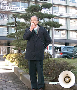 翌朝、市役所本庁の玄関前で「不当解雇撤回を求め市当局とあらゆる手段で争っていく」とマイクで戦闘宣言を発しました。