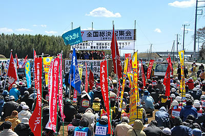 三里塚芝山連合空港反対同盟主催の全国総決起集会が成田空港暫定滑走路東の市東孝雄さんの畑を会場に開かれた。全国から840人が結集し、北原鉱治事務局長が被災者救援と原発即時停止を訴える反対同盟声明を発した。