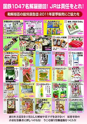 沖縄労働運動の転換を切り開くぞ!というバヤリース労組物販へのご協力に心からお礼申し上げます。いよいよ「核(原発)」と「基地沖縄」と「安保」の3本柱に決着をつける時が見えてきました。辺野古基地建設を止めて来た沖縄労働運動と大震災情勢と対決する反失業・反原発のうねりを一つにする心棒こそ国鉄闘争全国運動です。引き続き11年夏季物販へのご協力をお願いします。