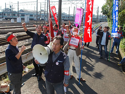 (写真 動労水戸は、JR東による労働者への被曝強制、外注化に10・8、13と2波のストライキで闘いぬいた【写真は10月8日 茨城県・勝田車両センター前】)