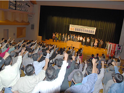 辺野古新基地建設攻撃の超緊迫情勢の中で2012年は、沖縄の「復帰」40周年です。同時に沖縄バヤリース労組の結成20周年に当たります。来年は、間違いなく「沖縄労働運動の復権」の正念場となります。焦点は一点、青年部の獲得です。私たちは、これをもって元気よく‘12春闘ストに突入すると確認しています。