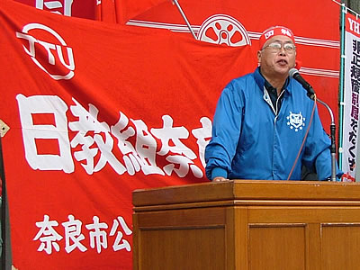 ここに立てたとき、わずか百数十人の日教組奈良市が市内1800の教育労働者に団結を呼びかけることを決断できました。組織拡大が始まり、勤務時間管理シート白紙撤回を勝ちとり、ついに昨年末、県費講師の職からもAさんを意図的に追放したことを謝罪し、「市費教員任用継続時の試験制度撤廃」を市教委が約束するに至りました。職場に加えられる新自由主義の攻撃をとらえて離さず絶対反対の闘いに歩み出したとき、動労千葉との連帯も、3・11情勢のもとでの連続的な反原発闘争と11月全国労働者集会への結集も一筋につながってきたのです。団結の拡大を総括軸にして、2012年この道をさらに前進したいと思います。