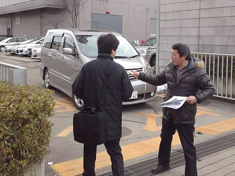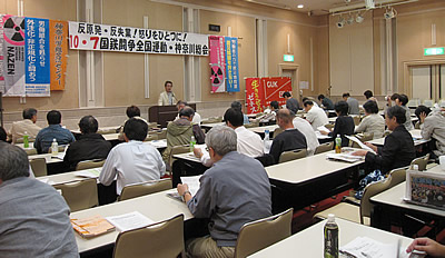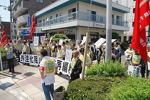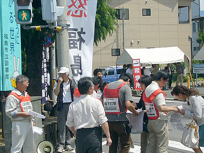 自治労第144回中央委員会会場前に、自治体労働者部会、福島、宮城の労組交流センターが登場。国鉄闘争全国運動6・10全国集会への大結集、反原発、橋下打倒への総決起を全国から来た自治労組合員に熱烈に訴えた。反原発署名は1時間で90筆を超えた。