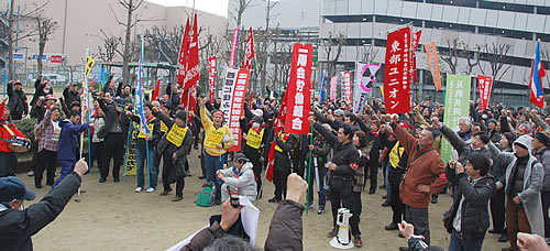 さらに、自治体労働者の獲得です。橋下・維新につながる千代松が昨年4月泉佐野市長になってから、職員給与20%カット攻撃、「こども園」攻撃、今年さらに激化し「市の名前を売る」、「震災不燃がれき受け入れ−被曝労働強制」「飼い犬税」「市の駐車場をコンビニに貸す」など、新自由主義攻撃を全面化させてきました。「泉佐野市で起きていることで関空と関係ないことは何一つない。これこそ新自由主義の命より金もうけ路線だ」と批判して「千代松を打倒しよう」と呼びかけて闘っています。