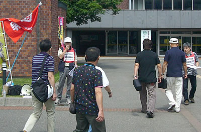 7月11日から2日間、被災地の仙台で開催されたNTT労組大会の初日、全国労組交流センター電通労働者部会の仲間は、被災地フクシマから全国のNTT労働者に熱烈に訴える宣伝行動を行った。全国から集まった代議員、傍聴者の大きな注目を集めた。