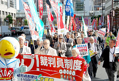 「裁判員制度はいらない!大運動」の呼びかけで、都心のど真ん中を貫いて最高裁デモが闘われた。320人の大隊列が組合旗を翻して行進、「裁判員制度やめろ!」の声が官庁・オフィス街に響きわたり、労働者の圧倒的な注目と共感を集めた。