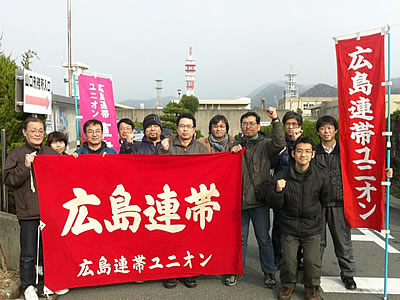 3月19日、山口刑務所に囚われていた無実の広島連帯ユニオン草津病院支部の中山崇志委員長(左から6人目)をついに奪還! 完全黙秘、非転向を貫いて勝利者として仲間に迎えられました。資本の不当な弾圧は、青年労働者の階級のリーダーを精悍に打ち鍛えました!(医療福祉労働者部会 S)