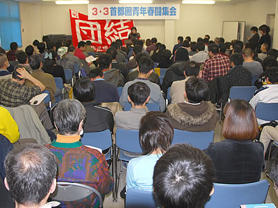 千葉市・DC会館で首都圏青年春闘集会が開かれ、雇用・賃金破壊、外注化・非正規職化の攻撃に、怒りと悔しさをかみしめながら職場で立ち上がった青年労働者が大結集。動労千葉、動労水戸の青年を先頭に医療、郵政、自治労などの青年たちが春闘―2013年を団結拡大で勝利する決意を打ち固めた。