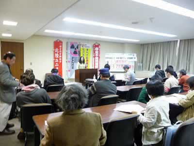 北陸ユニオン主催、ス労自主、NAZEN北陸共催の北陸春闘集会が富山県民会館で行われた。元全日本運輸一般労組原発分会長の斉藤征二さんを招き、解雇撤回・民営化・外注化粉砕、反原発、安倍政権打倒のスローガンの下、北陸3県の労働者・学生・市民が結集した。