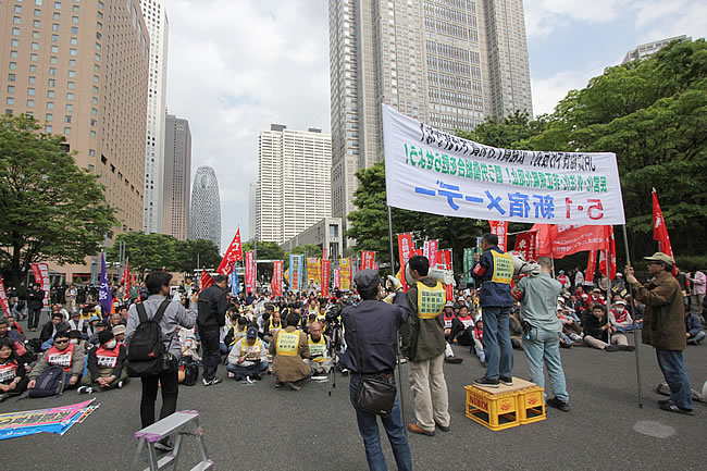 (写真 5月1日、動労千葉・動労総連合の呼びかけでJR貨物本社抗議行動と新宿メーデーが闘い抜かれた。メーデー集会には515 名が結集【新宿中央公園】)
