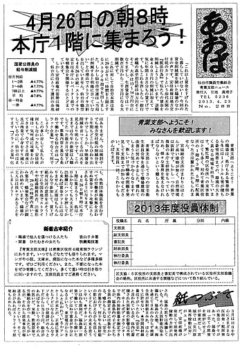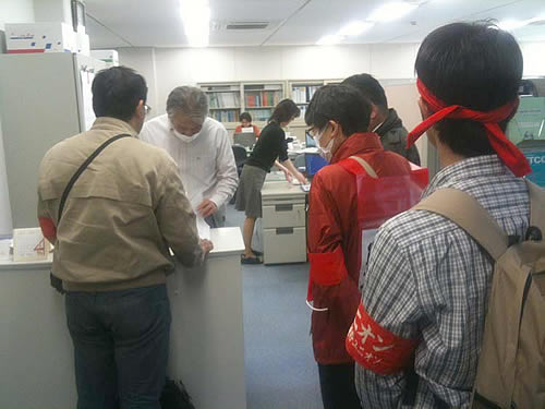 5月23〜24日の自治労中央委員会でも、賃下げ絶対反対の闘争報告が全体をリードしています。さらに橋下大阪市長による現業丸ごと民営化による分限免職攻撃に対して、「自治労の総力で闘うべき」とする意見が多数出ています。わが交流センターの闘いと現場の怒りの結合が、体制内労組幹部の敗北主義によってつくりだされてきた抑圧、支配の構造を揺るがしつつあるのです。