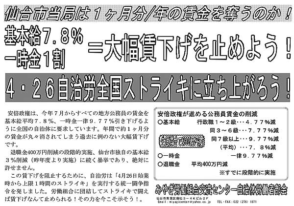 地方公務員給与削減絶対阻止! 4〜5月闘争に続き、自治労6月ストライキを全国で闘い抜き、階級的労働運動の新しい時代を切り拓こう!