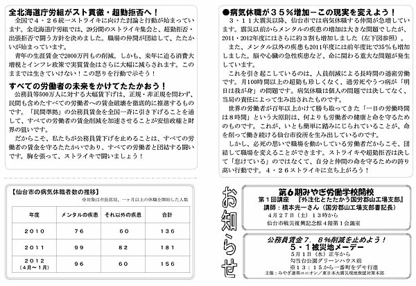 それともう一点、この1カ月間の間に本当に大きな闘いだったのは、7.8%地方公務員労働者に対する賃下げ攻撃と4・26自治労のストライキに対して、僕らがこれに現場から怒りの声と具体的な闘いを作るために全国で総決起をしたという画期的な闘いがやれたということです。これは本当に大きかった。初めての経験ですよね。自治労のストライキそのものは大したことないんですよ。実行されたってもう本当に体制内的な怒りをごまかすためだけのものです。何が画期的かと言うと、ここから時代の転換点を作り上げるんだと捉えて全国の現場に必死になって訴えてそこから労働組合をもう一回僕らの手に取りもどす闘いにわれわれが突っ込んでいったことです。そこが大事なんです。そういうことができる情勢になった。つまり体制内的な連中もふくめて二進も三進も行かなくていろいろな連中が引きずり出されてそこに僕らがいるってことが大事なんです。こういう闘いができたことは大きな地平です。