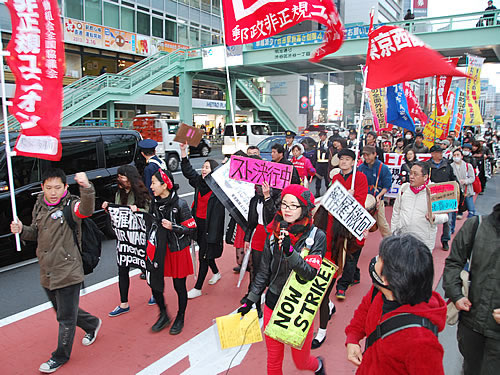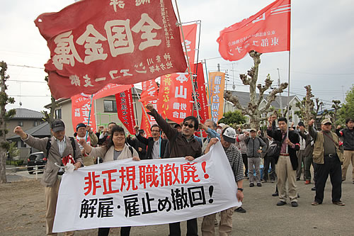 さいたまユニオンとJAM神奈川ジェコー労組を軸とする実行委員会が呼びかけた「非正規では生きられない!派遣切りから4年/ショーワ・ジェコー弾劾行動」が全国から延べ150人の結集で闘われた。ショーワ本社工場包囲からジェコー本社工場にデモをかけ、団結して解雇撤回まで闘い抜く決意を叩きつけた。