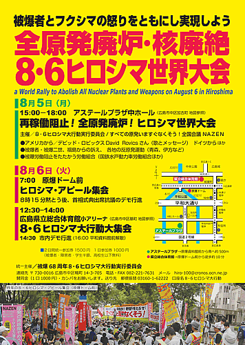 ヒロシマ・ナガサキ・ビキニを、そしてフクシマを繰り返えさないために、8・6ヒロシマの地に集り、「全原発廃炉・核廃絶の世界大会」を共に実現しよう。