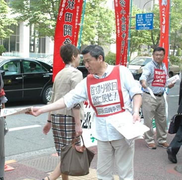 国労組合員資格確認訴訟の第8回口頭弁論が、東京地裁民事第11部(団藤丈士裁判長)で開かれた。4・9政治和解を拒否して闘う4人の闘争団員は、組合員資格剥奪を居直る国労本部を徹底的に弾劾。裁判に先立ち、国労本部を弾劾し、6・9国鉄集会への大結集を訴える宣伝行動が裁判所前で行われた。