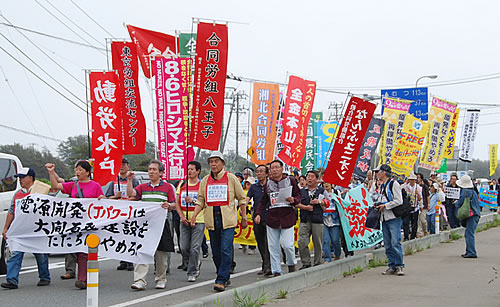 第6回大間原発反対現地集会が開催され、500人の結集で大成功した。集会実行委事務局長の中道雅史さんが、むつ中間貯蔵施設に対する今秋闘争と、大間原発建設中止を勝ちとる闘いを強めることを訴えた。NAZEN50人の部隊は第2挺団でデモ。動労水戸、全金本山、ス労自主、各地の合同労組などの旗が翻った。