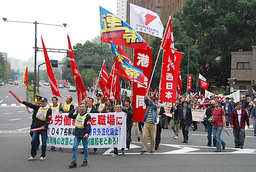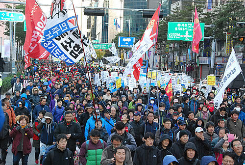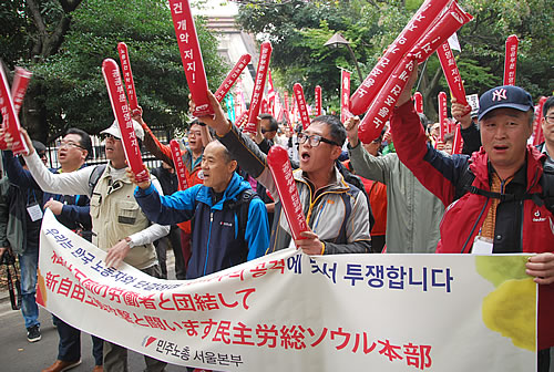 (写真 集会後、デモ行進する呼びかけ3労組と民主労総などの隊列【11月3日 日比谷】)